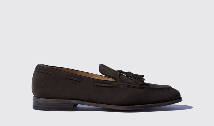 Our ‘Duccio Ebano Scamosciato Leggero’ tassel loafers from our summer collection are handcrafted on an Italian shoe last by skilled artisans in our manufactory in Italy. The classic men’s shoe is handcrafted in a light-weight construction which is perfect for summer. The summer version of our 'Duccio' has a leather sole made of soft greased leather with rotellato detail applied by hand and is stitched in the blake welt method. Due to this construction, the shoe has more flexibility. The tassel loafer is made out of high-quality ebony suede leather.