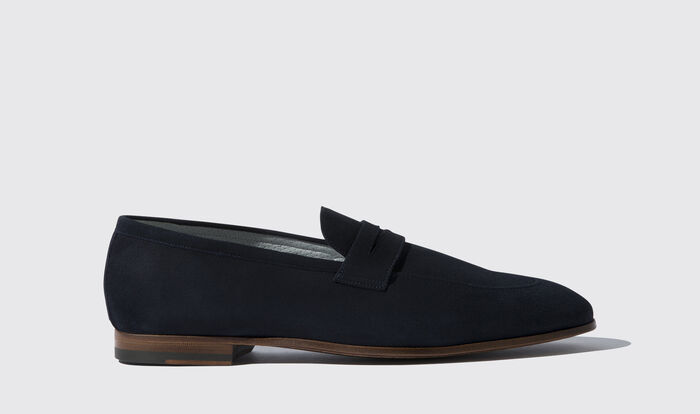 Our ‘Marzio Abisso Scamosciato’ penny loafers from our flexible sole family are handcrafted on an Italian shoe last by skilled artisans in our manufactory in Italy. These shoes are crafted from dark blue suede leather and have a lining made of perforated leather which makes the shoes very comfortable to wear and provides improved natural breathability of the leather. These shoes, which are stitched in the blake welt method, have a single leather sole made of soft greased leather which makes them extremely flexible and provides exceptional comfort, perfect for the summer.