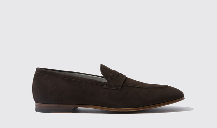 Our ‘Marzio Moro Scamosciato’ penny loafers from our flexible sole family are handcrafted on an Italian shoe last by skilled artisans in our manufactory in Italy. These shoes are crafted from dark brown suede leather and have a lining made of perforated leather which makes the shoes very comfortable to wear and provides improved natural breathability of the leather. These shoes, which are stitched in the blake welt method, have a single leather sole made of soft greased leather which makes them extremely flexible and provides exceptional comfort, perfect for the summer.