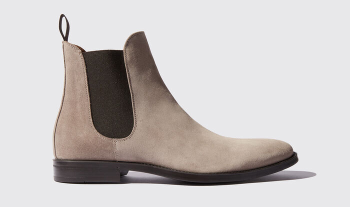 Our 'Giacomo Taupe' Chelsea Boots are handcrafted on our timeless Italian last by our experienced artisans in Montegranaro, Italy. We have crafted this classic style for winter with a full rubber sole in the Blake method, which makes these Chelsea Boots more durable for rainy days. Our 'Giacomo Taupe' are crafted from taupe-coloured Italian suede leather and have a significant contrast stretch in dark brown.