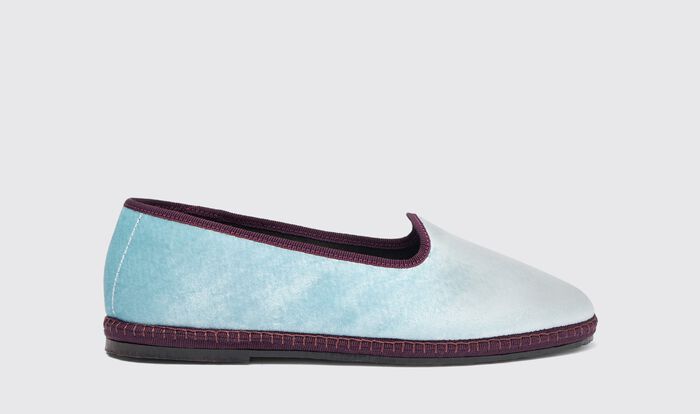 Our 'Valentina' Friulane shoes are handcrafted in Friuli, limiting the number of pairs produced and making each shoe unique. Made from a velvet shimmery fabric, their color changes depending on the light. With its velvety surface, the shoe box provides an exquisite touch.